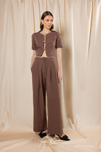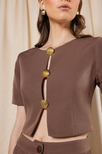 This cropped top is a bold blend of vintage charm and sharp tailoring. Featuring structured short sleeves and sculptural gold rosette buttons down the front, it’s cut to contour with a clean round neckline and a sharp notched hem. A striking yet versatile piece that pairs effortlessly with both high-waisted trousers and skirts.