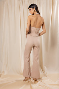 Halter neckline with open back. Front rushed detailing. Pointed hemline.