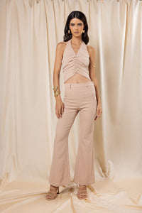 This rushed halter top features a flattering gathered front and pointed hemline that enhances the waist. Cut from soft stretch crepe, it offers a sculpted yet comfortable fit with an open back for added edge. Perfect for pairing with tailored pants or skirts for a sleek day-to-night look.