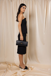 A timeless staple, this high-waisted black midi skirt is cut in a sleek pencil silhouette for a flattering and sophisticated look. Designed in structured crepe, it pairs effortlessly with both minimalist and statement tops for versatile styling.