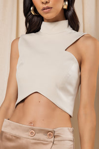 Bold and architectural, this structured crop top features a high neckline with a striking asymmetric cut across the chest. The pointed hem adds edge to the silhouette, while the fitted shape flatters the waist. Crafted from stretch crepe, it blends sharp tailoring with modern minimalism.