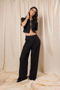 This cropped top is a bold blend of vintage charm and sharp tailoring. Featuring structured short sleeves and sculptural gold rosette buttons down the front, it’s cut to contour with a clean round neckline and a sharp notched hem. A striking yet versatile piece that pairs effortlessly with both high-waisted trousers and skirts.