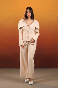 - Neckline: Dramatic oversized fold-over shawl collar.