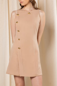 Tailored with a modern edge, this sleeveless mini dress features a sharp asymmetric neckline and a striking gold button detail along the front panel. Cut from structured crepe, it hugs the body in all the right places for a flattering, sleek silhouette. Perfect for day events or elevated evenings out.