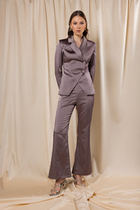 Cut from glossy satin, these high-waisted pants feature a slim fit through the thigh and a soft flare at the hem for a leg-lengthening silhouette. Designed for both structure and fluidity, they perfectly complement the matching blazer or any elevated evening top.
